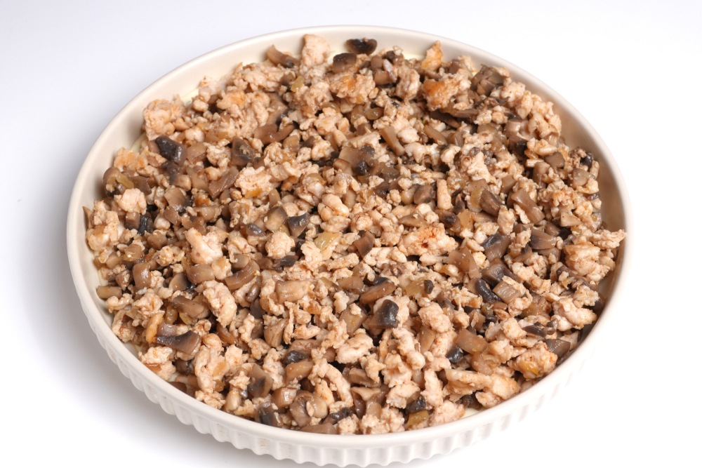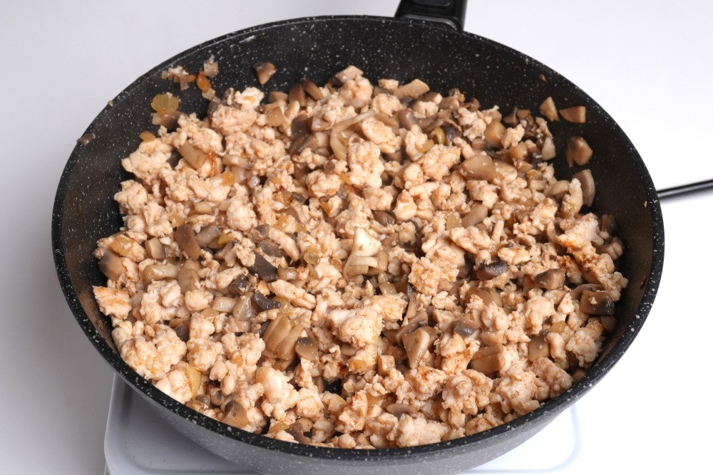 Вернуть в сковороду фарш, перемешать с грибами. Огонь выключить и оставить начинку остужаться.