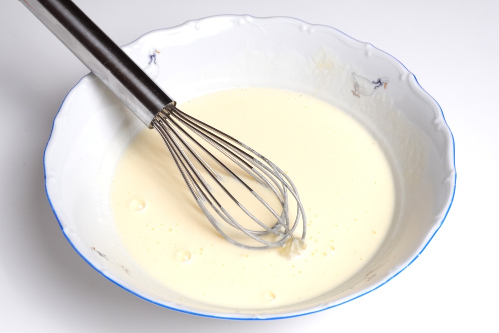 Просеять в тесто муку и разрыхлитель, перемешать до однородности. В тесте не должно оказаться комочков. При необходимости, перемешать можно миксером.