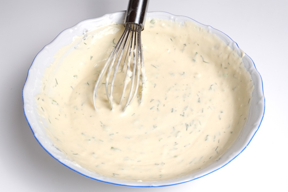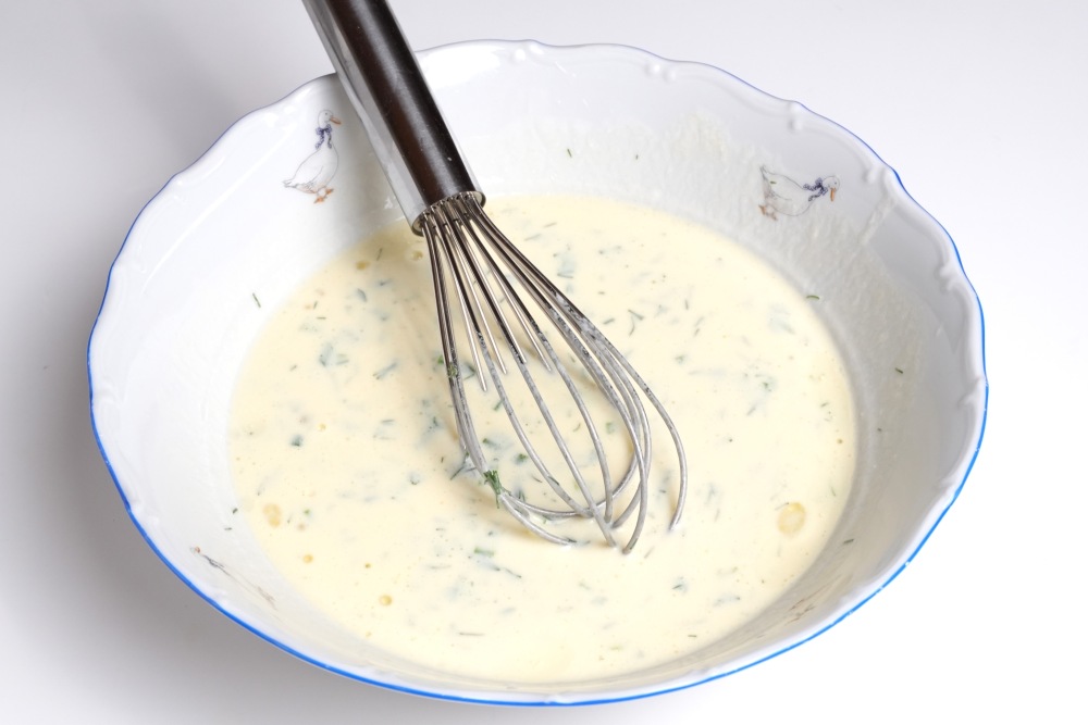 Добавить в кефир зелень, соль и растительное масло. Еще раз перемешать.