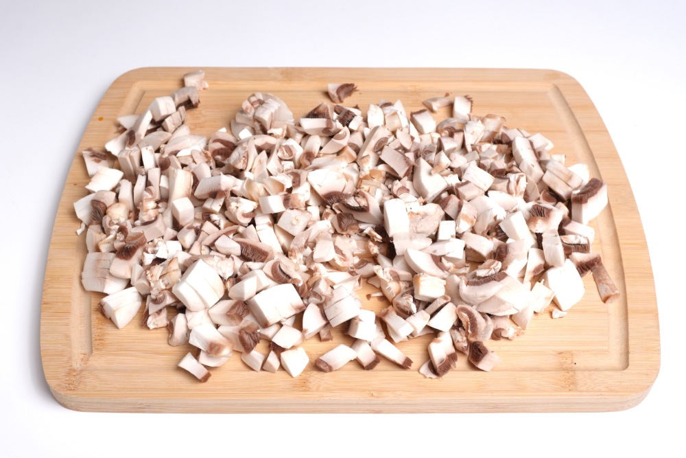 Грибы нарезать мелко. Чем мельче будет начинка, тем нежнее получится пирог. Но учитывайте, что в процессе жарки они еще уменьшатся в два раза, поэтому не нужно резать совсем мелко, в труху.
