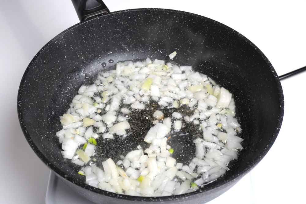 Сковороду разогреть, добавить растительное масло (2 столовые ложки). Выложить лук и обжаривать на среднем огне до золотистости.