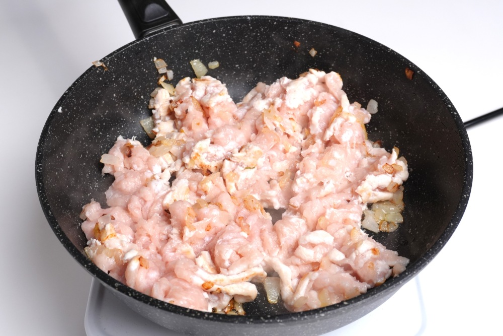 К луку добавить фарш, перемешать и лопаткой “разбить” все крупные куски. Обжаривать фарш, помешивая, 5-7 минут.
