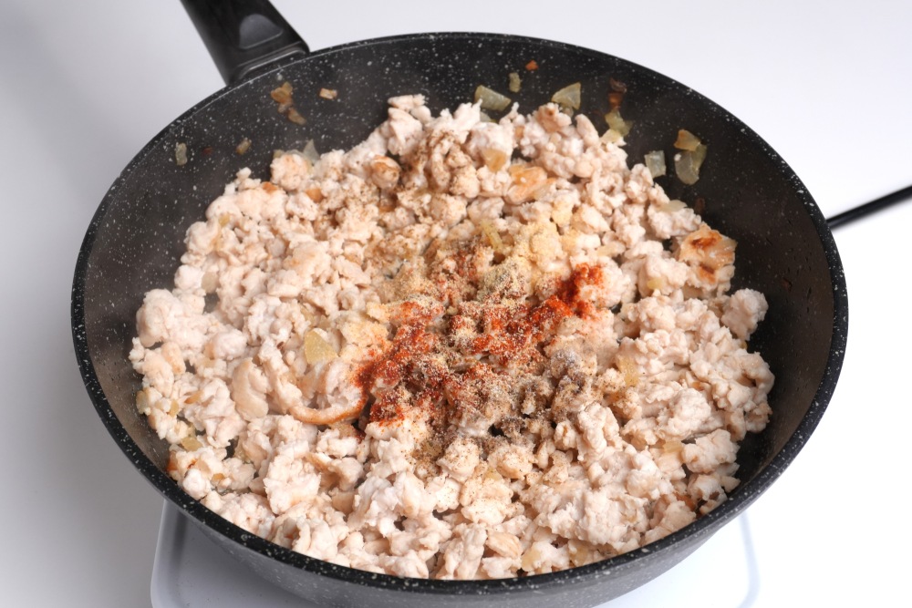 Добавить в фарш специи, соль, хорошо перемешать и обжаривать еще 2-3 минуты. Специи я всегда добавляю на этапе обжарки, так они лучше раскрывают свой аромат.