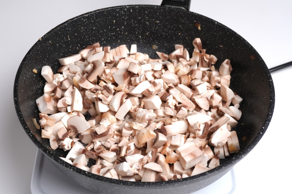 На этой же сковороде обжарить шампиньоны. Дополнительно масла лучше не добавлять, но если не уверены в сковороде, можно немного смазать поверхность. Обжаривать шампиньоны на среднем огне 3-5 минут.