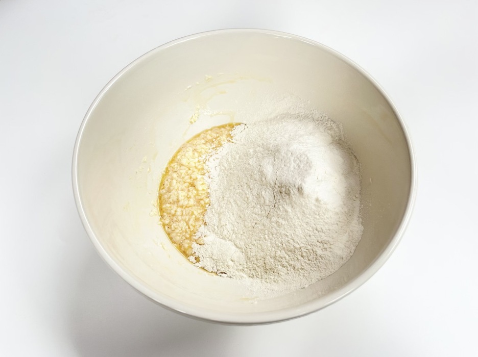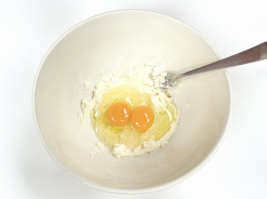Добавить к маслу яйца и перемешать до однородности. Тут удобнее использовать блендер. Опять же, если масло и яйца комнатной температуры, текстура будет гладкой. Если яйца будут холоднее масла, оно начнет замерзать и “комковаться”. Это не сильно повлияет на вкус, но лучше все-таки брать продукты одной температуры.
