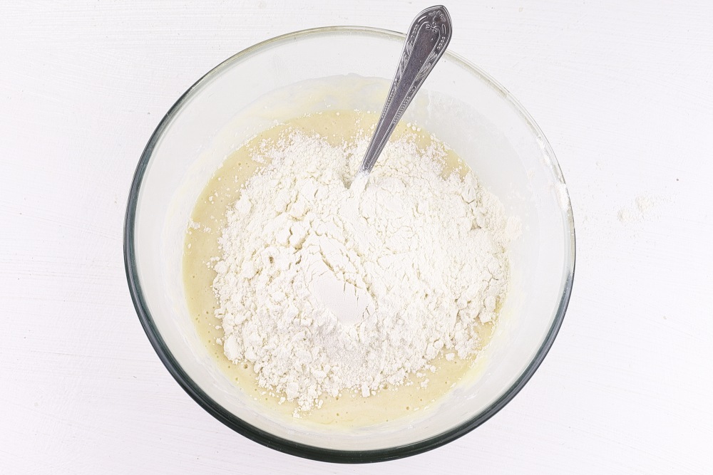 Всыпать примерно 3 столовые ложки с горкой муки из общего количества.