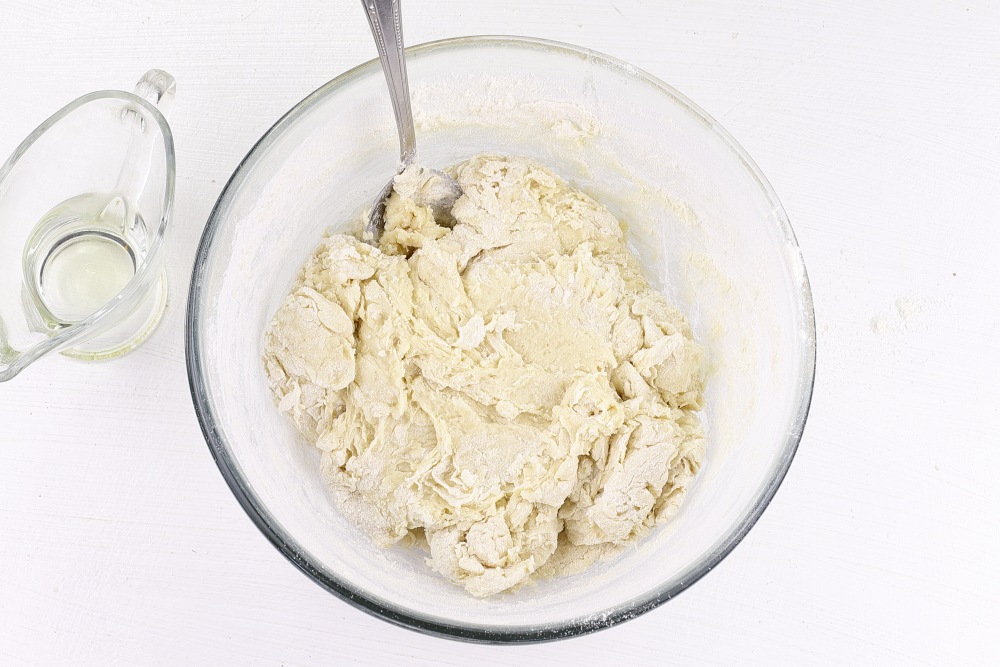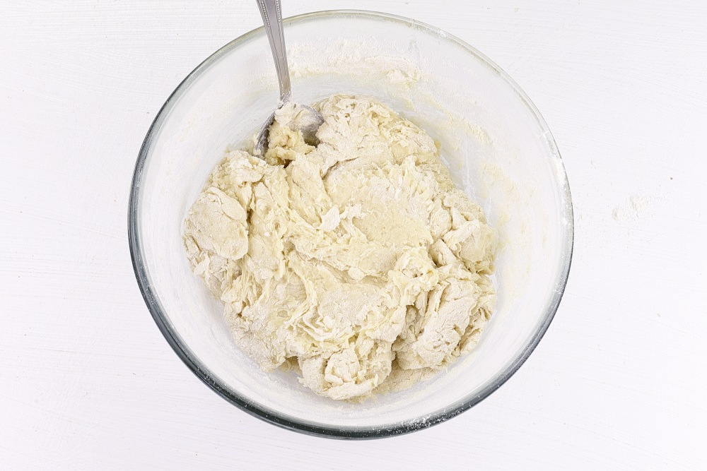 После каждой подсыпки муки хорошо перемешать ложкой. На данном шаге у меня еще осталось примерно 2 столовые ложки муки. Лучше тесто мукой не забивать.