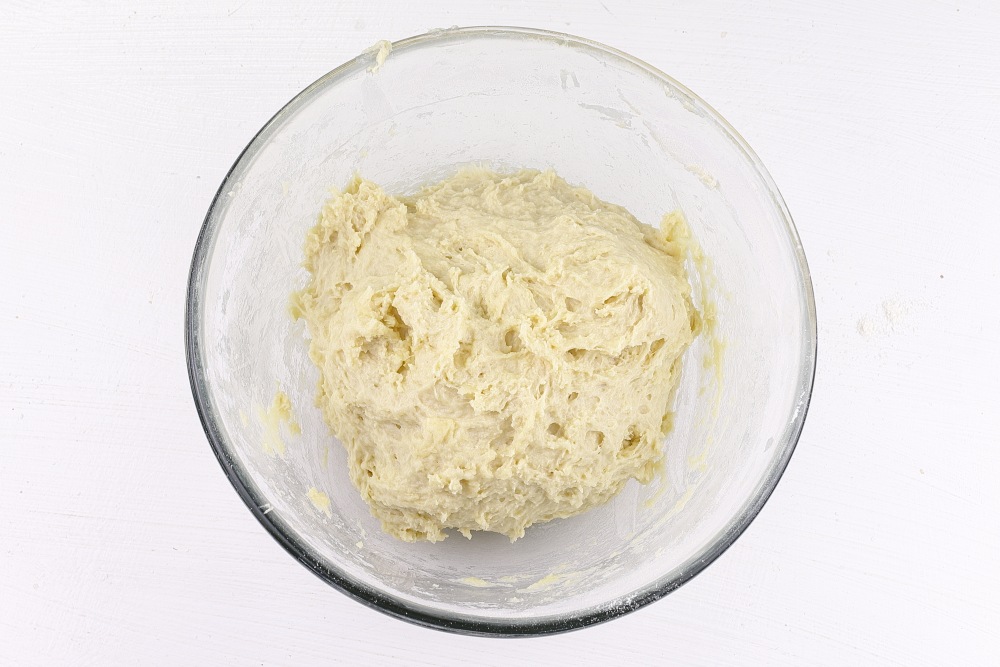 Хорошо перемешать руками, вмешивая масло в тесто. Для замеса можно использовать тестомес. На данном этапе тесто получается липкое.