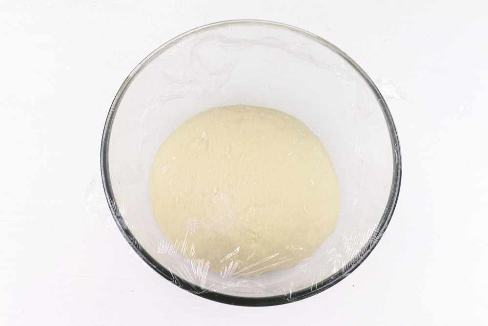Глубокую миску смазать растительным маслом. Выложить тесто. Накрыть пищевой пленкой или чистым кухонным полотенцем, чтобы тесто не высыхало, и отправить в теплое место на 50-60 минут.
