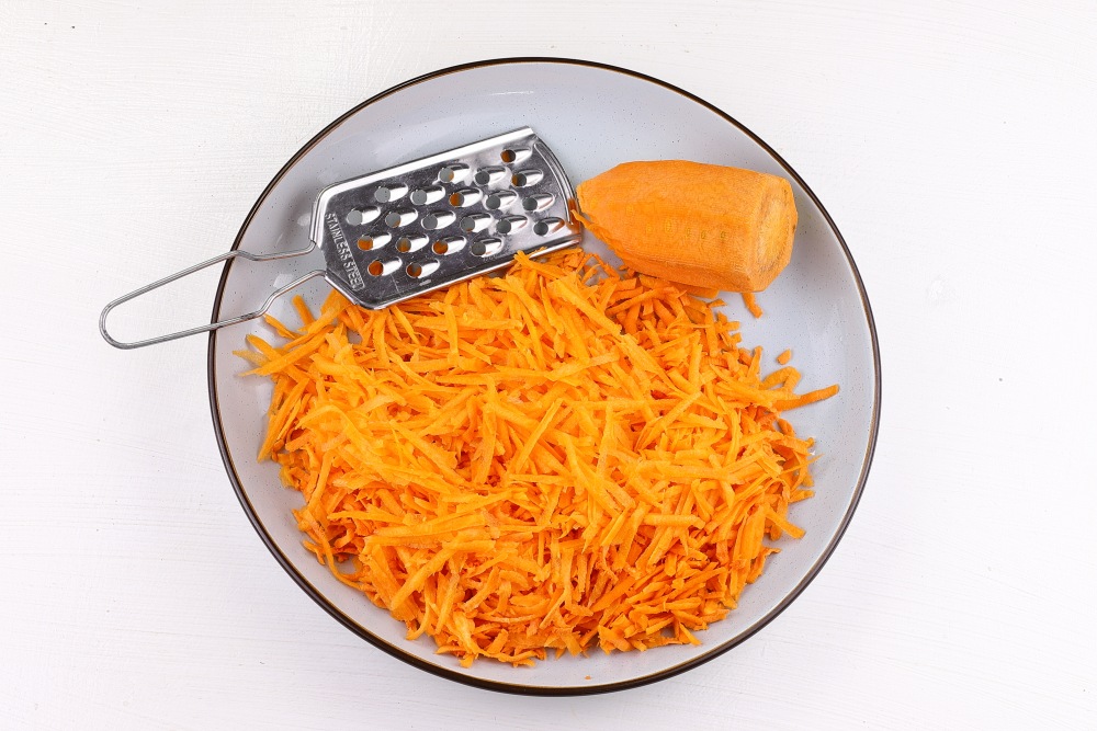 Морковь очистить от кожицы. Хорошо сполоснуть и обсушить бумажным полотенцем. Измельчить на крупной терке.
