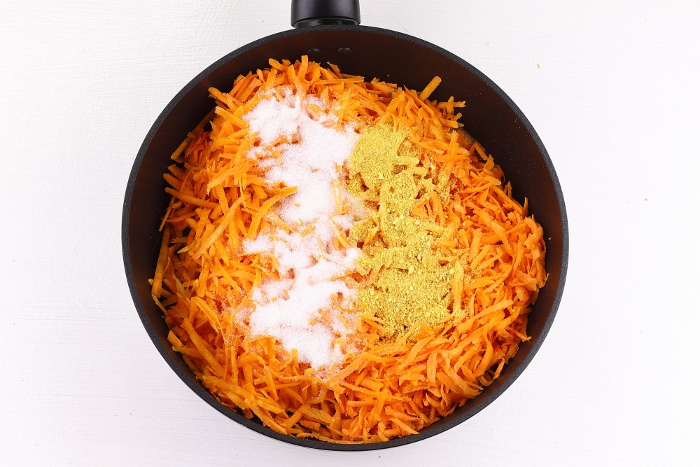 В глубокой сковороде растопить сливочное масло. Добавить натертую морковь.