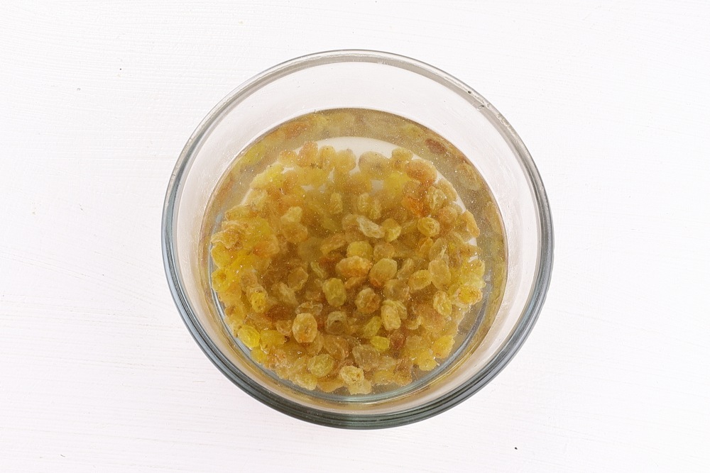 Изюм хорошо промыть. Залить горячей водой на 10-15 минут, чтобы он стал более мягким.