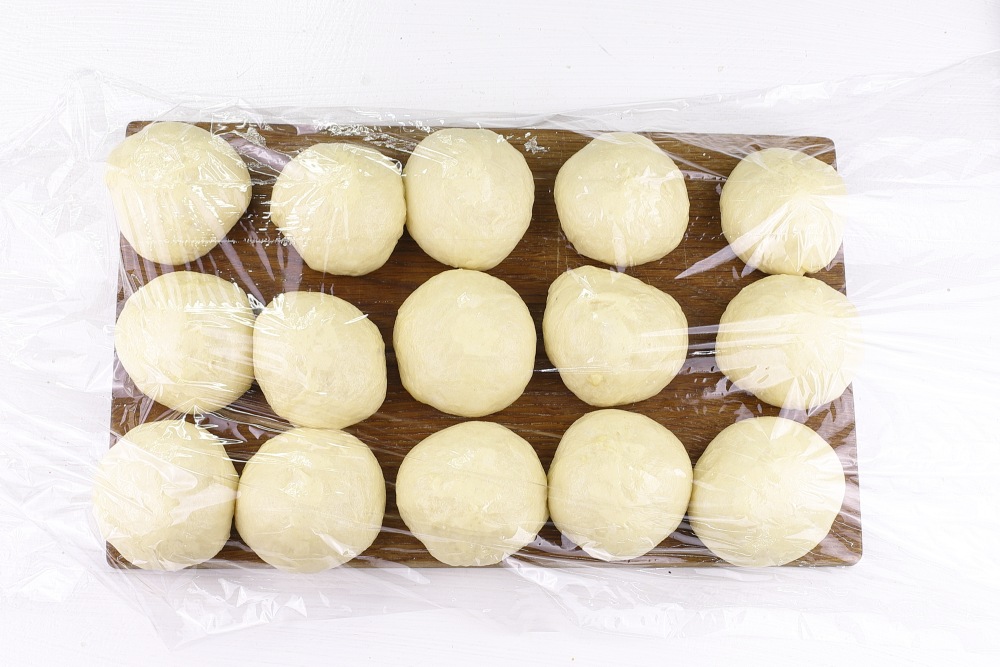 Разделить тесто на 15 кусочков. Сформировать колобки. Вес одного шарика примерно 60 г. Накрыть пищевой пленкой. Оставить на 20-30 минут в теплом месте.