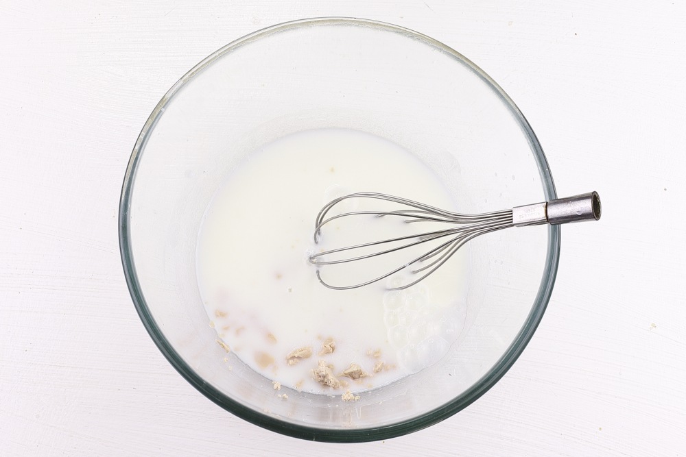 К жидкости покрошить руками свежие дрожжи. Перемешать ручным венчиком, чтобы дрожжевые кусочки разошлись.