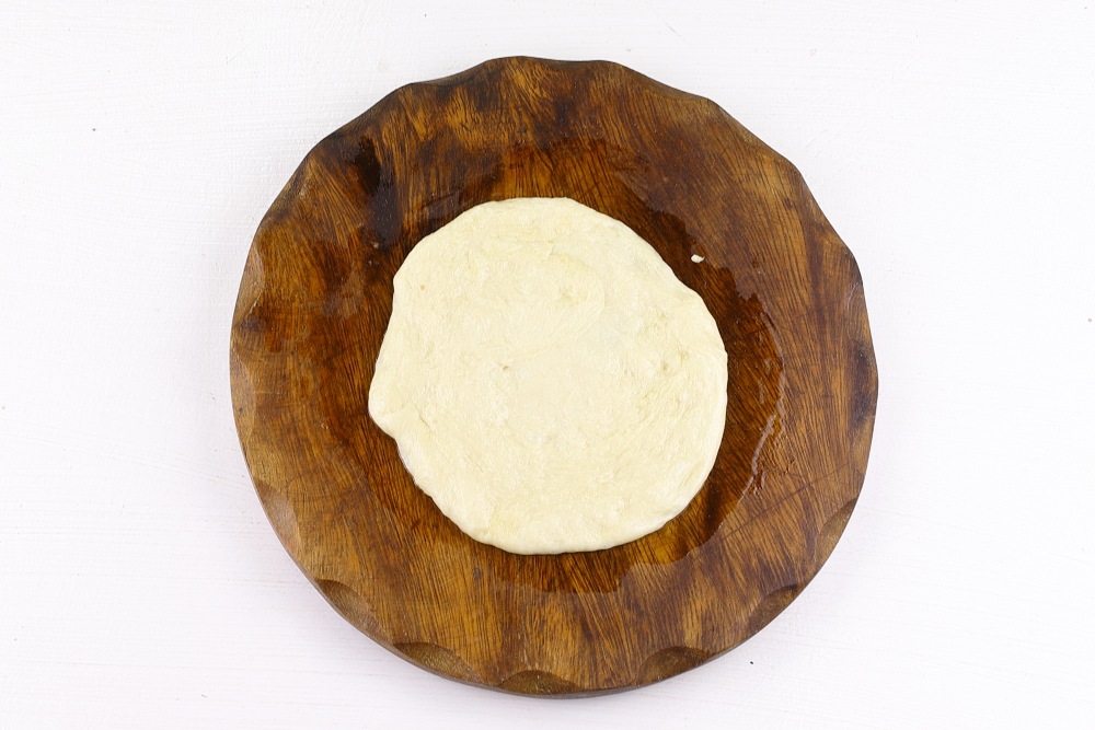 Распластать руками каждый колобок в лепешку не очень тонкую, смазывая руки растительным маслом.