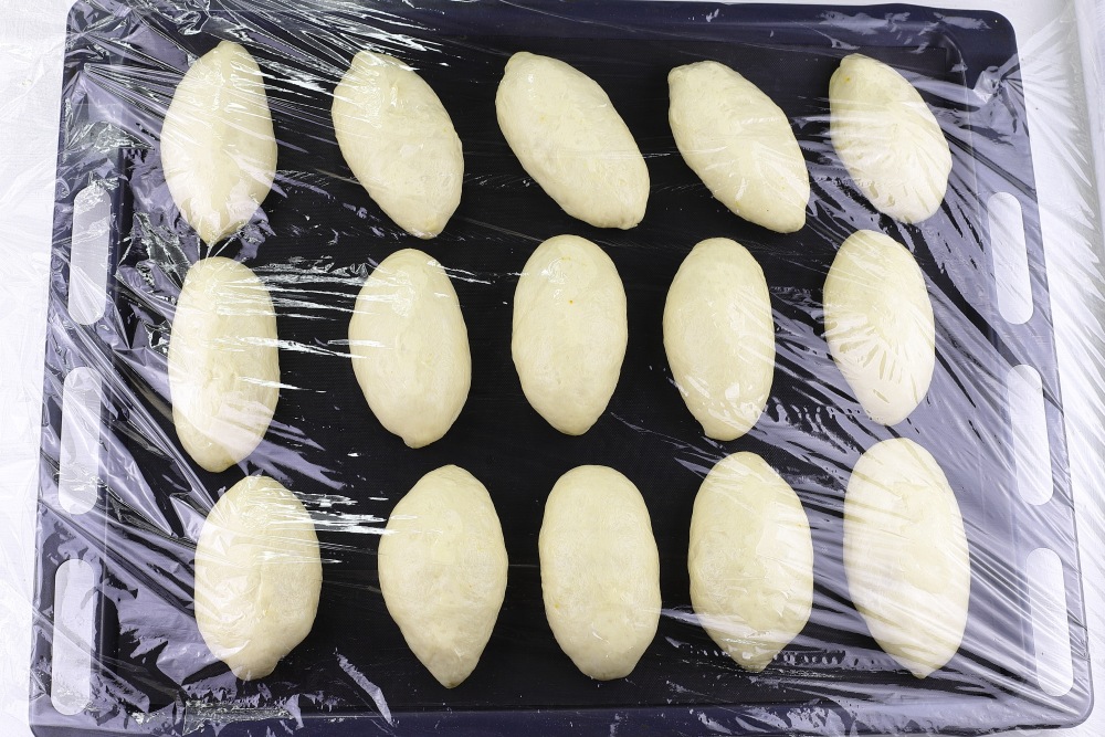 Выложить заготовки на противень с пергаментом на небольшом расстоянии друг от друга. Накрыть пищевой пленкой. Оставить в теплом месте на 20-30 минут.