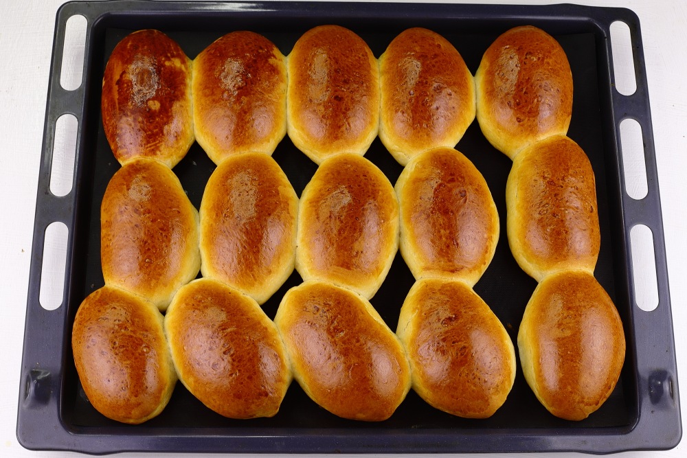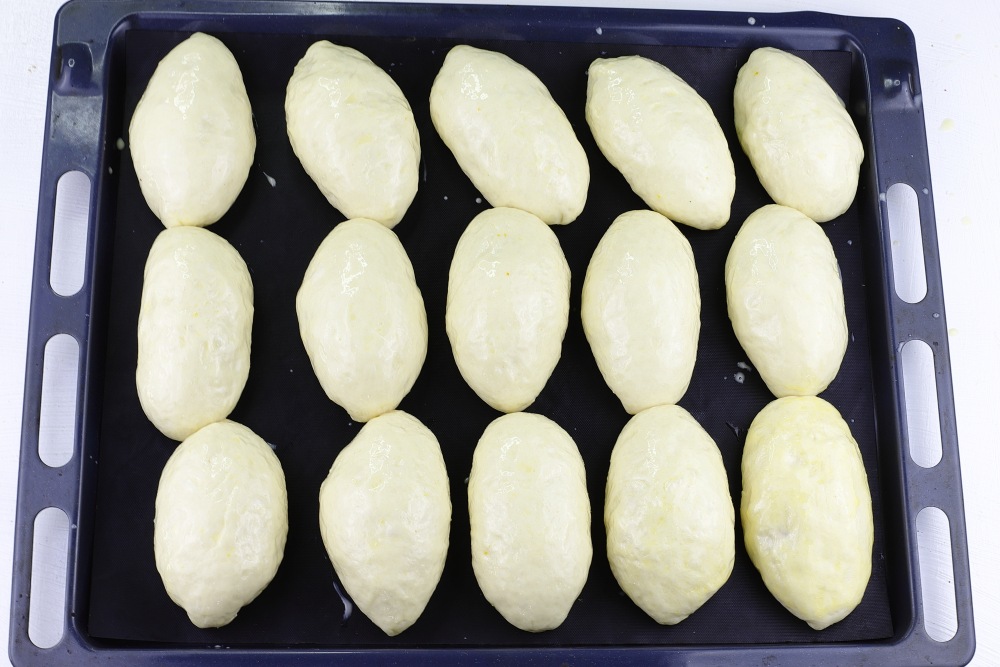 Отдохнувшие заготовки смазать взбитым желтком. Отправить в разогретую духовку на 30-35 минут при температуре 180°С, до румяного цвета.