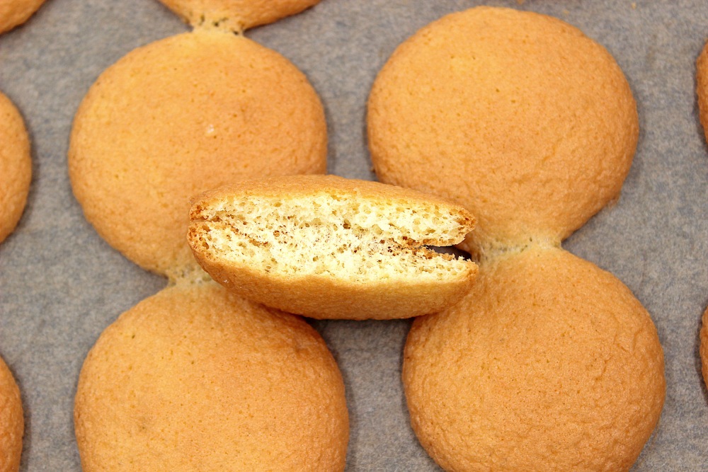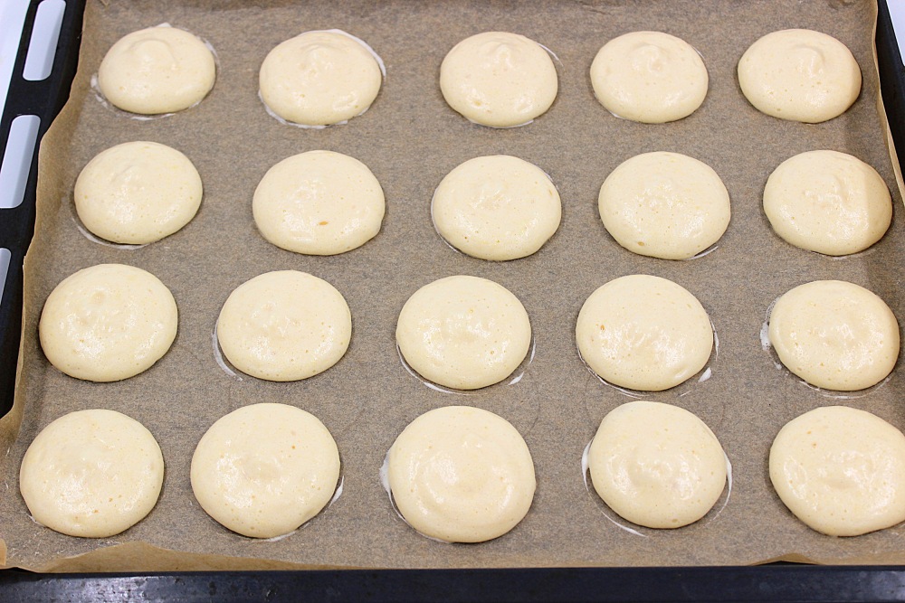 По количеству это 20 штук. Делать на небольшом расстоянии друг от друга. Я просто пока взбивались яйца опустила краешком кольцо и примерно обозначила места для своих будущих заготовок. Это поможет вам сделать аккуратные, одинаковые бисквиты.