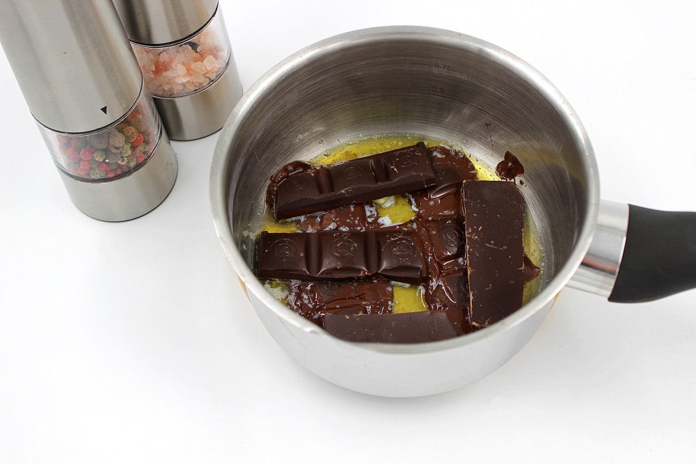 В ковшике, на малом огне, непрерывно помешивая растопить масло и шоколад.