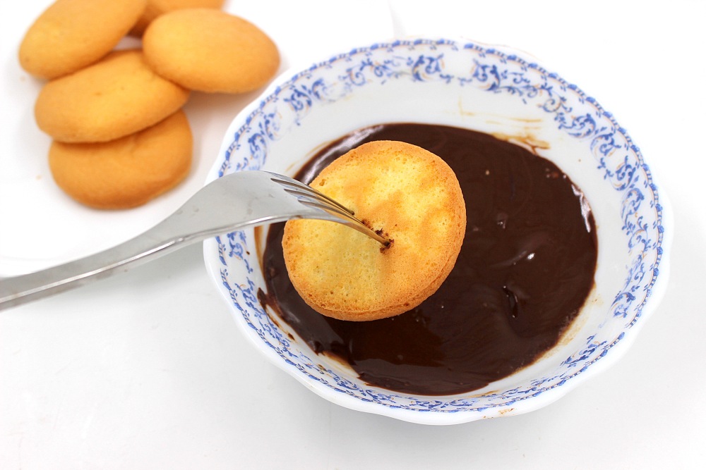 Насадить бисквит на вилку и опустить верхушку в шоколад. Чуть подержать боком, что бы стекло лишнее.