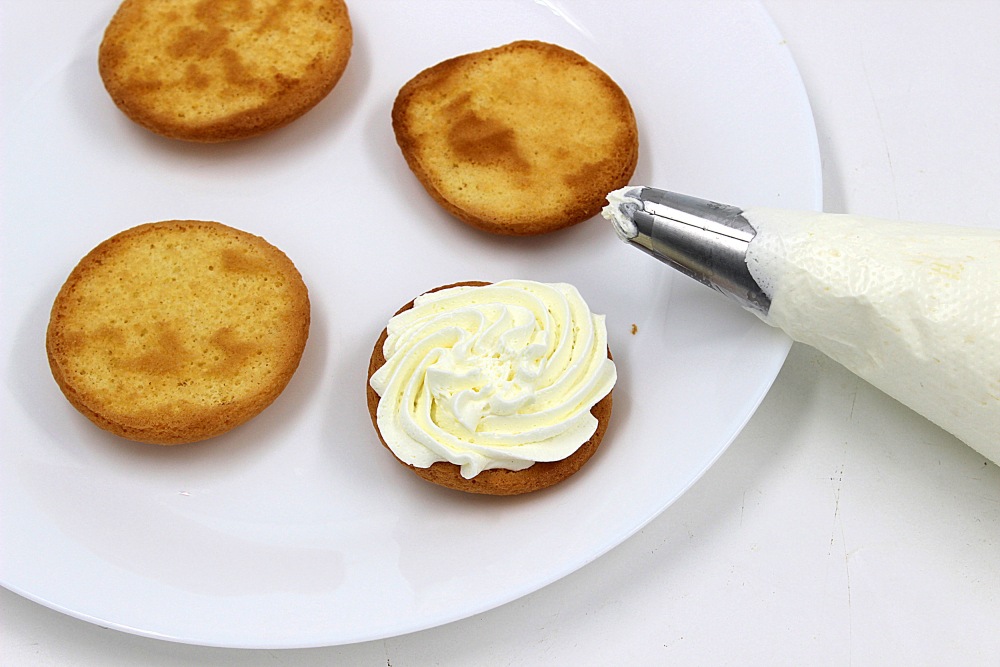 Сливки поместить в мешок с насадкой и отсадить на не глазированные, вторые половинки, примерно сантиметровым слоем.