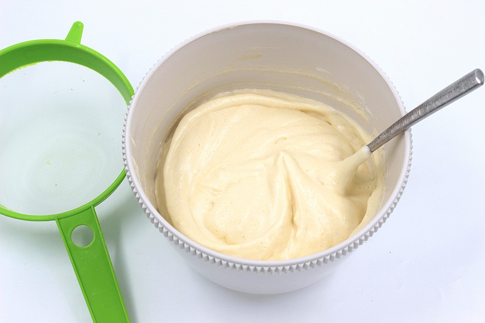 Перемешивайте от края вниз и к середине, при этом поворачивая миску. Тесто должно остаться пушистым, сохранять форму.