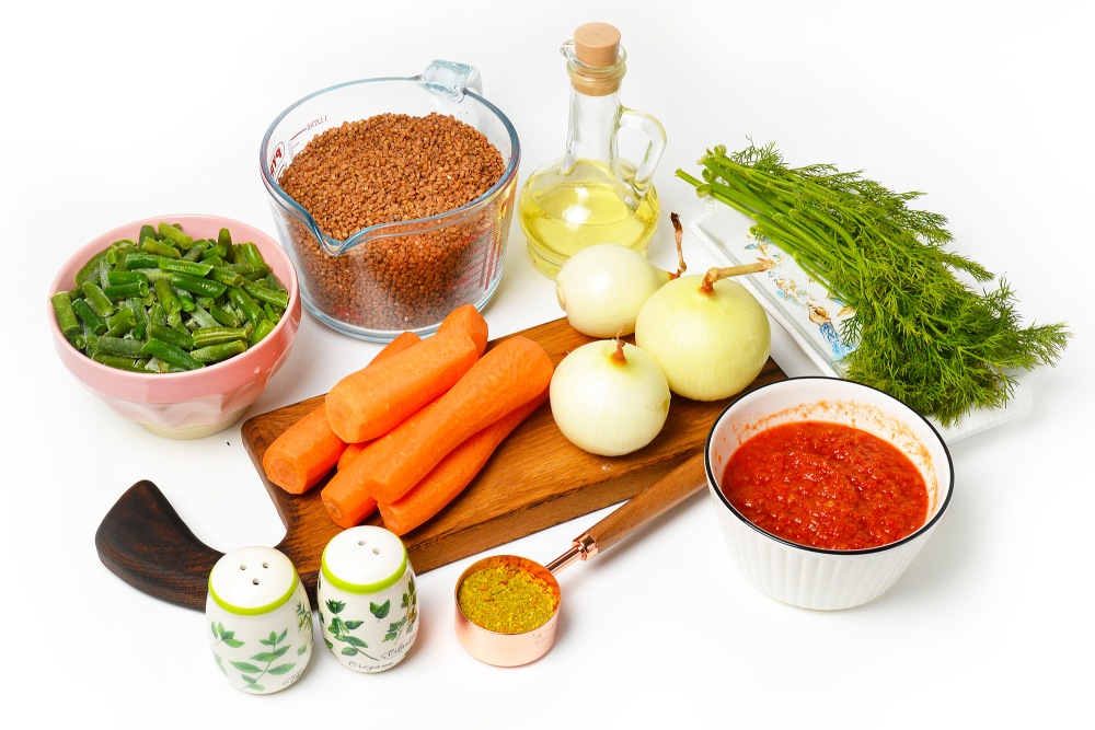 Подготовить ингредиенты: сухую гречку, стручковую фасоль, лук и морковь, томатный соус, соль, перец и приправу, а также масло для жарки.