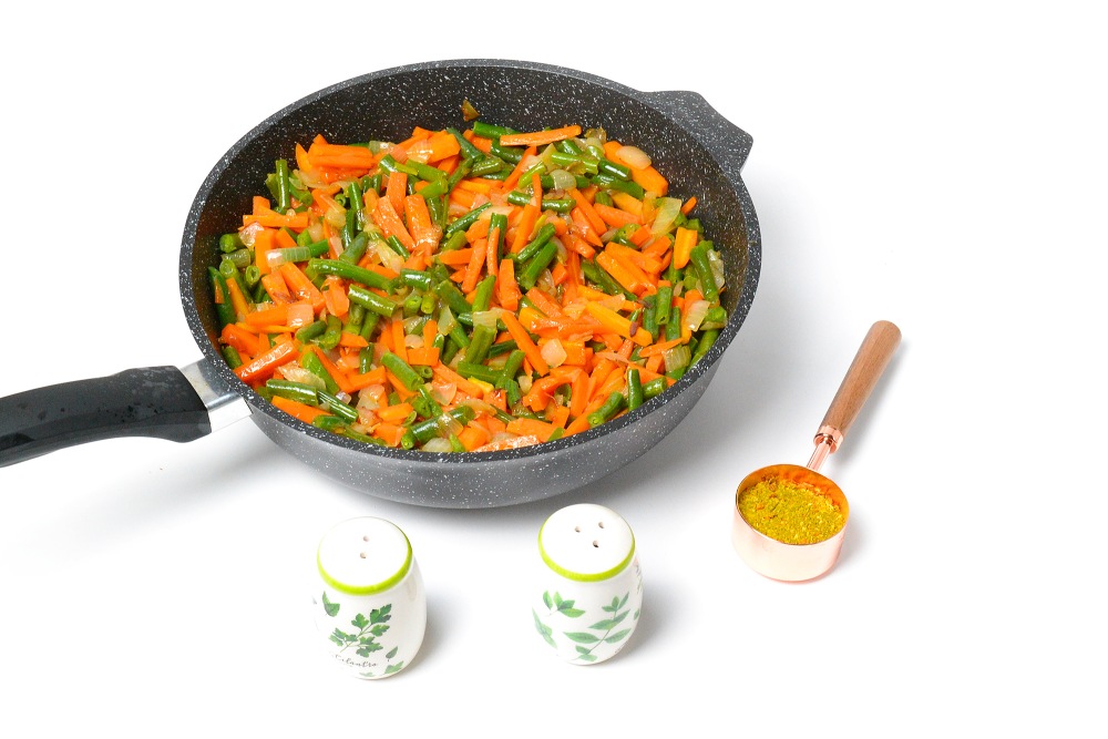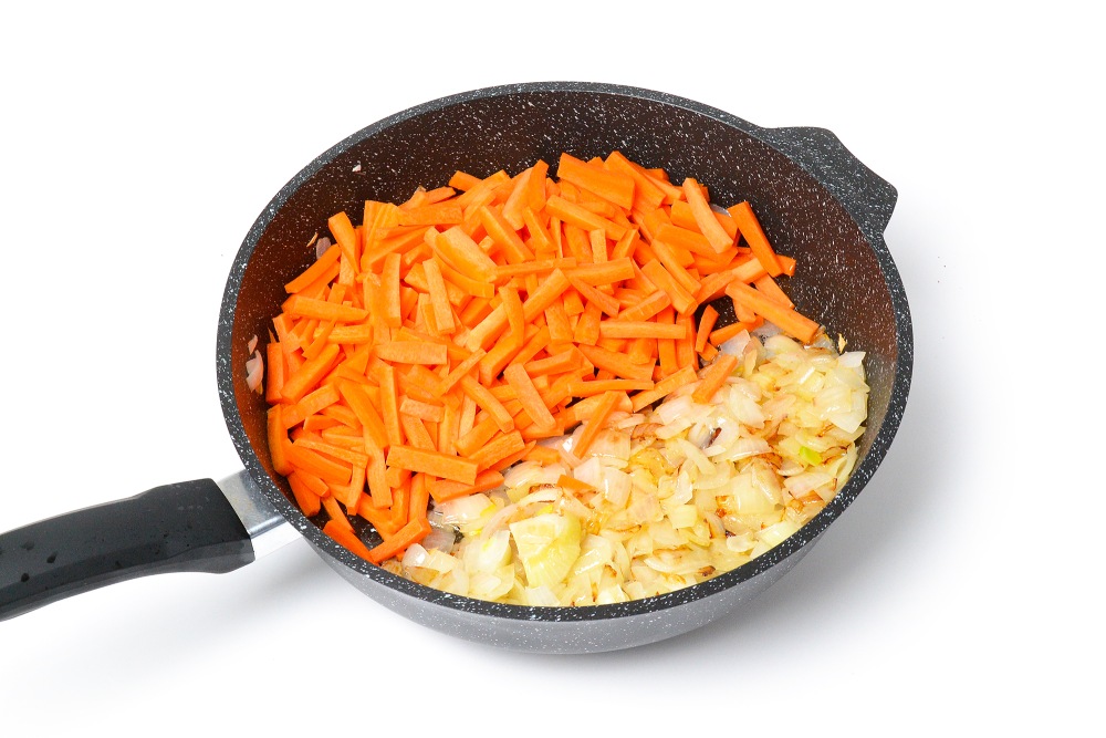 В сковороде хорошо разогреть растительное масло и обжарить лук до полупрозрачности минуты 3-4 на сильном огне. Добавить к нему морковь и жарить еще 5-6 минут до полумягкости овощей.