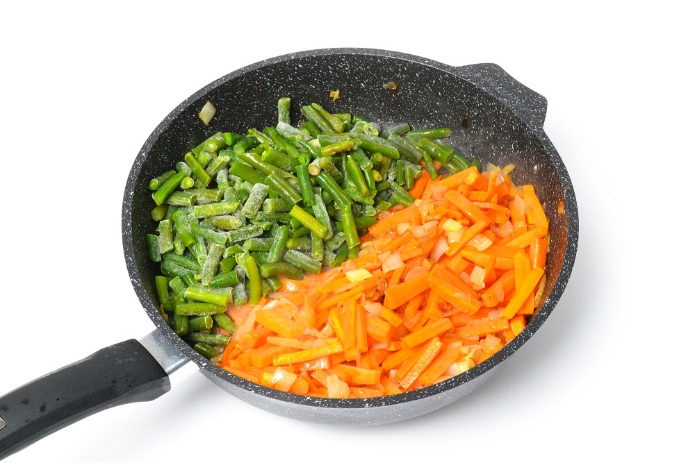 Всыпать оттаявшую фасоль и жарить еще 4-5 минут.