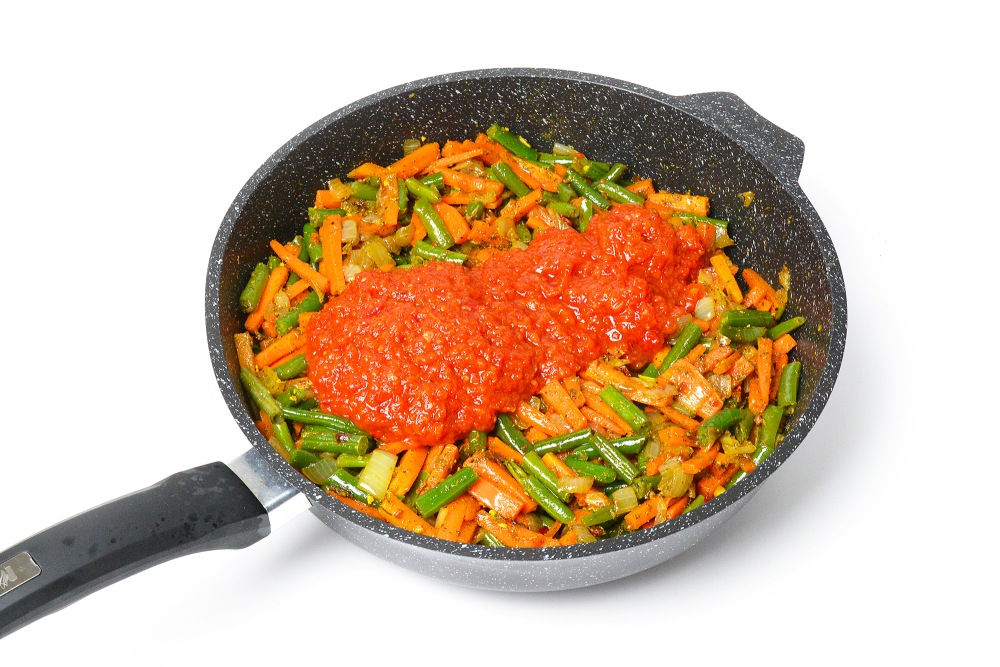 Добавить к овощам томатный соус, перемешать и прогреть еще несколько минут на сильном огне. Снять с плиты.