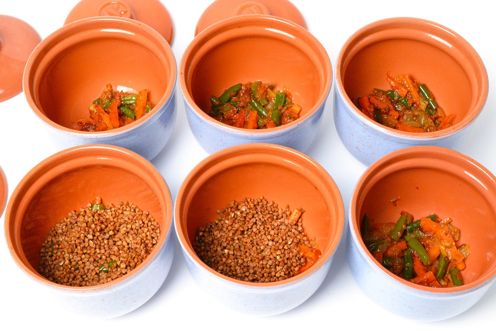 В горшочки выложить слоями овощи и гречку: 2-3 ложки поджаренных продуктов, 40-50 г промытой гречки, затем снова овощи и еще 40-50 г гречки. Для горшочков на 700 мл это оптимальные пропорции, заполняющие посуду наполовину или чуть больше.