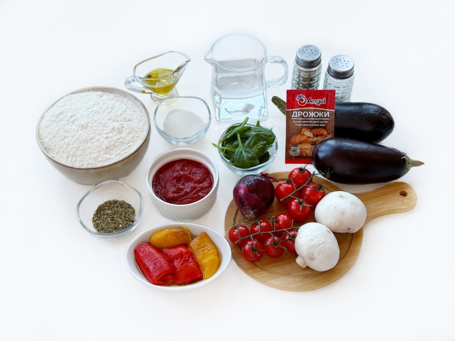 Подготовить ингредиенты для приготовления постной пиццы с баклажанами и грибами.