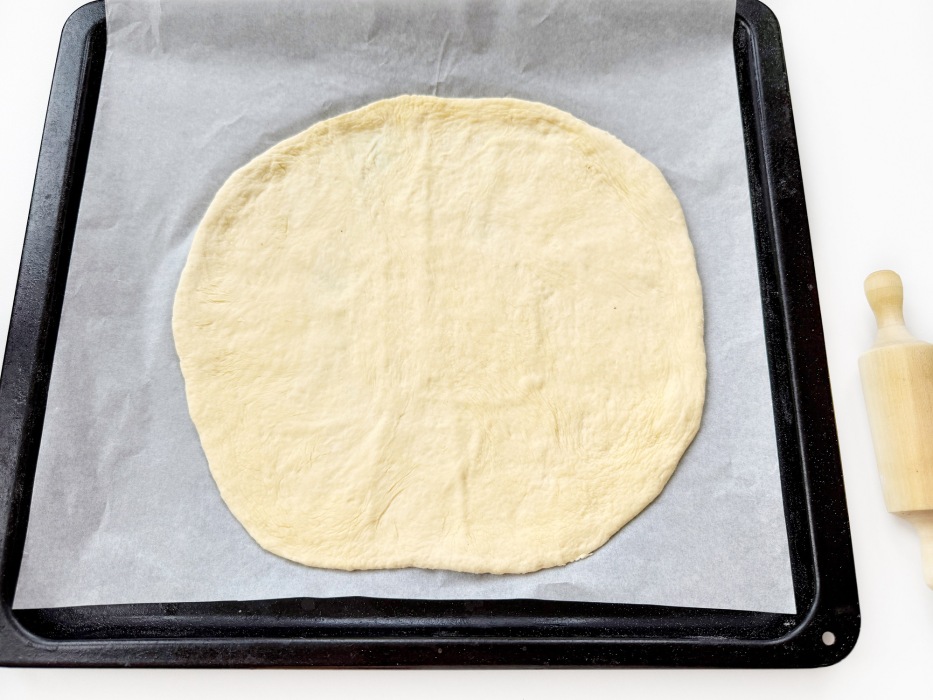 Разделить тесто на 2 части. Раскатать одну часть в круглую лепешку толщиной около 5 мм и переложить на противень с пергаментом.