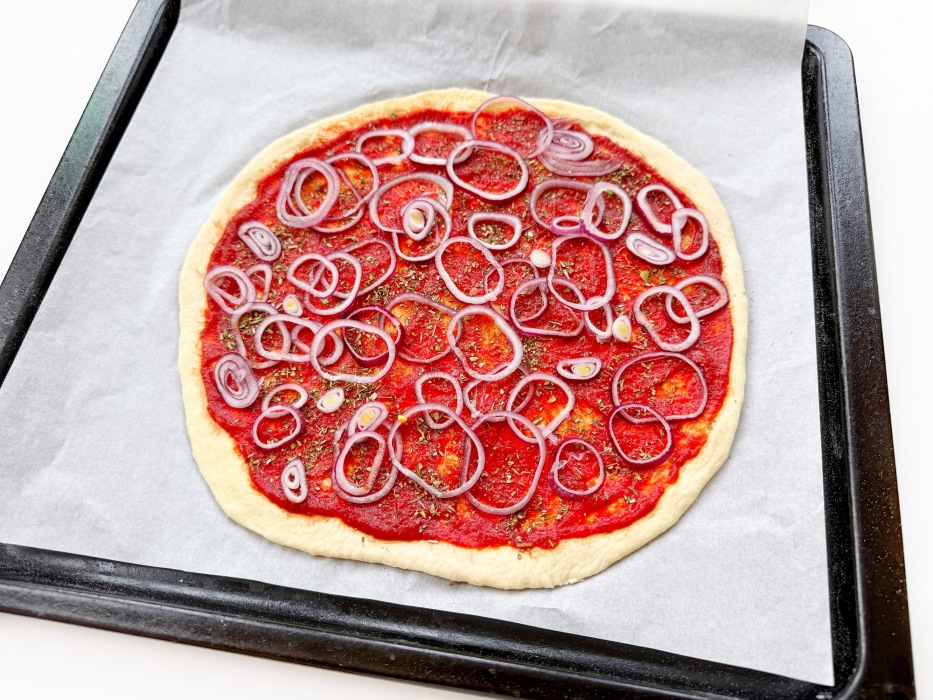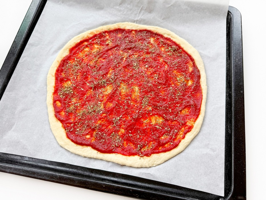 Намазать тесто томатной пастой и посыпать сушеным орегано.