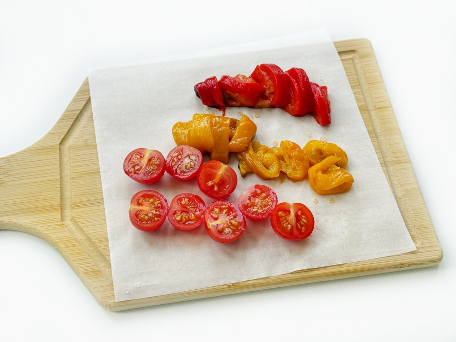 Нарезать помидоры черри и запеченный перец.