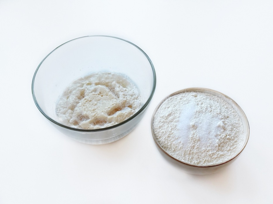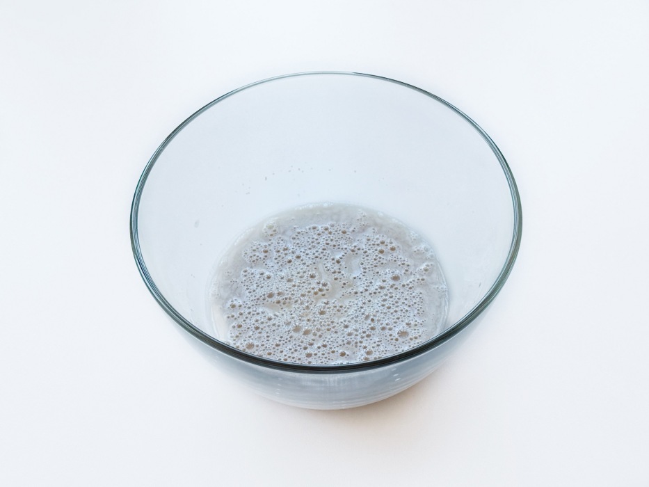 Соединить теплую воду, сухие дрожжи, сахар. Накрыть миску полотенцем и оставить в теплом месте до появления пенной шапочки.