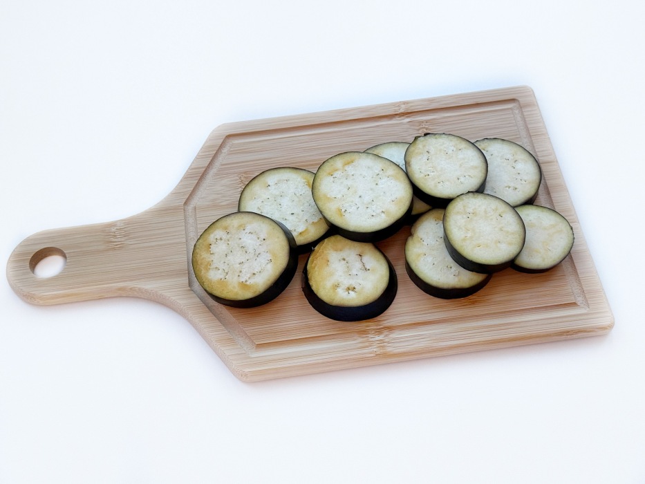 Нарезать баклажаны кружочками. Если у вас крупные баклажаны, их слегка посолить и оставить на 10 минут, чтобы убрать лишнюю горечь, затем промокнуть бумажным полотенцем.
