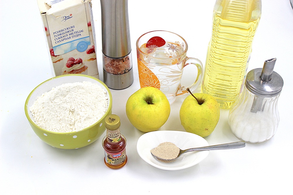 Подготовить ингредиенты для постных оладий с яблоками пышных. Если будете подавать оладьи, например, с вареньем или джемом, то сахарная пудра вам не нужна. Вода должна быть тёплой, до 40 градусов. Больше не надо. Термометр не обязателен. Просто опустите палец и почувствуйте теплоту, немногим выше температуры тела. Из этого количества у меня получается 14 шт.