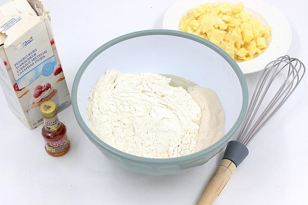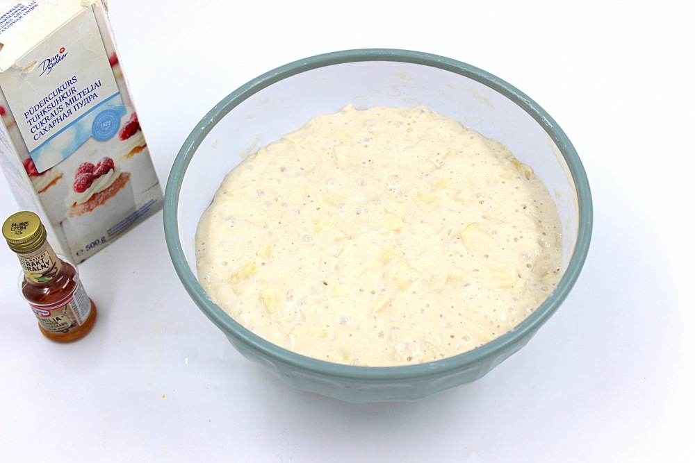 В миску добавить оставшуюся воду, столовую ложку растительного масла, ваниль, соль и муку.