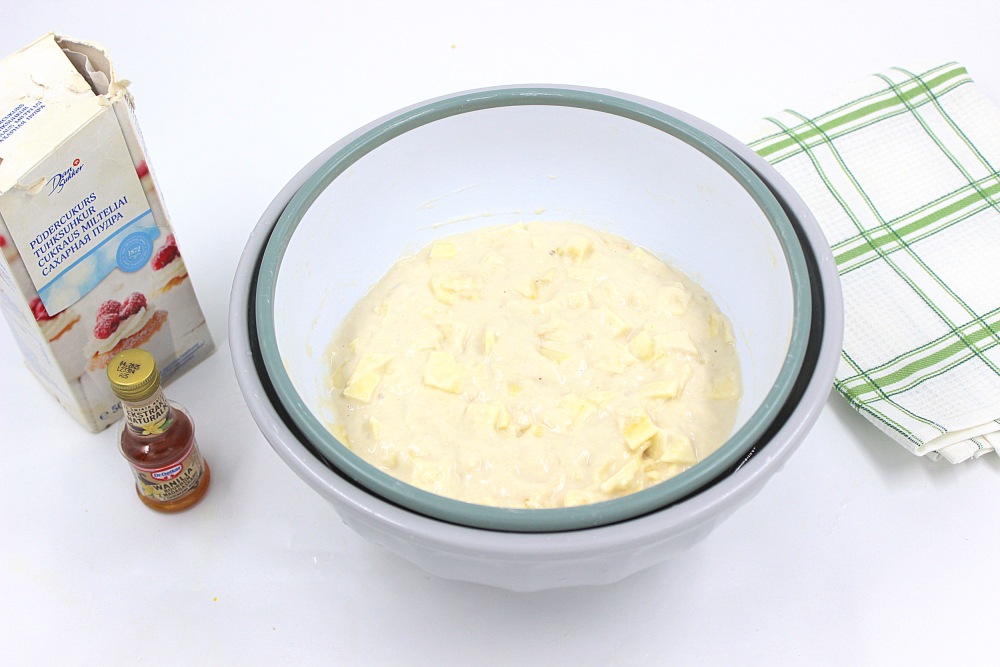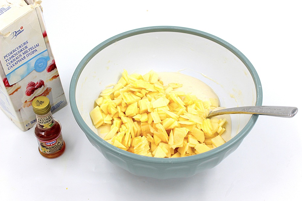 К тесту добавить мелко нарезанные яблоки.