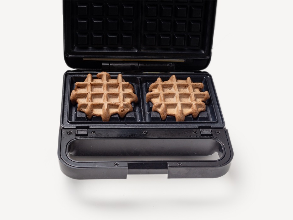 - Разогрейте вафельницу 3–5 минут, смажьте маслом кисточкой один раз — выкладывайте по 1 ст. л. теста на секцию, выпекайте 3–5 минут без открывания.
