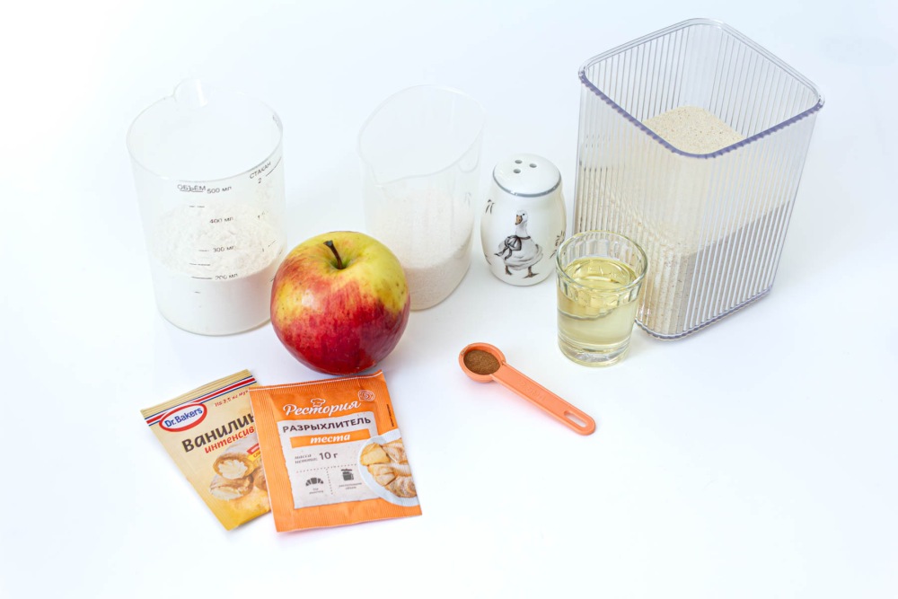 Выбрать качественные продукты. Манку, сахар, мука, яблоки, разрыхлитель и корица.