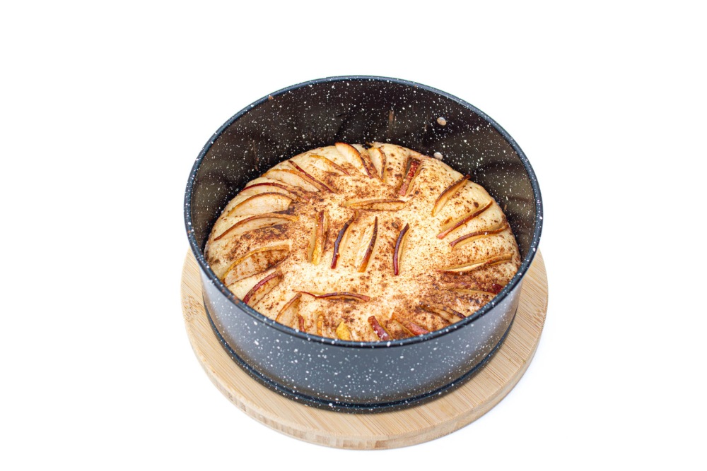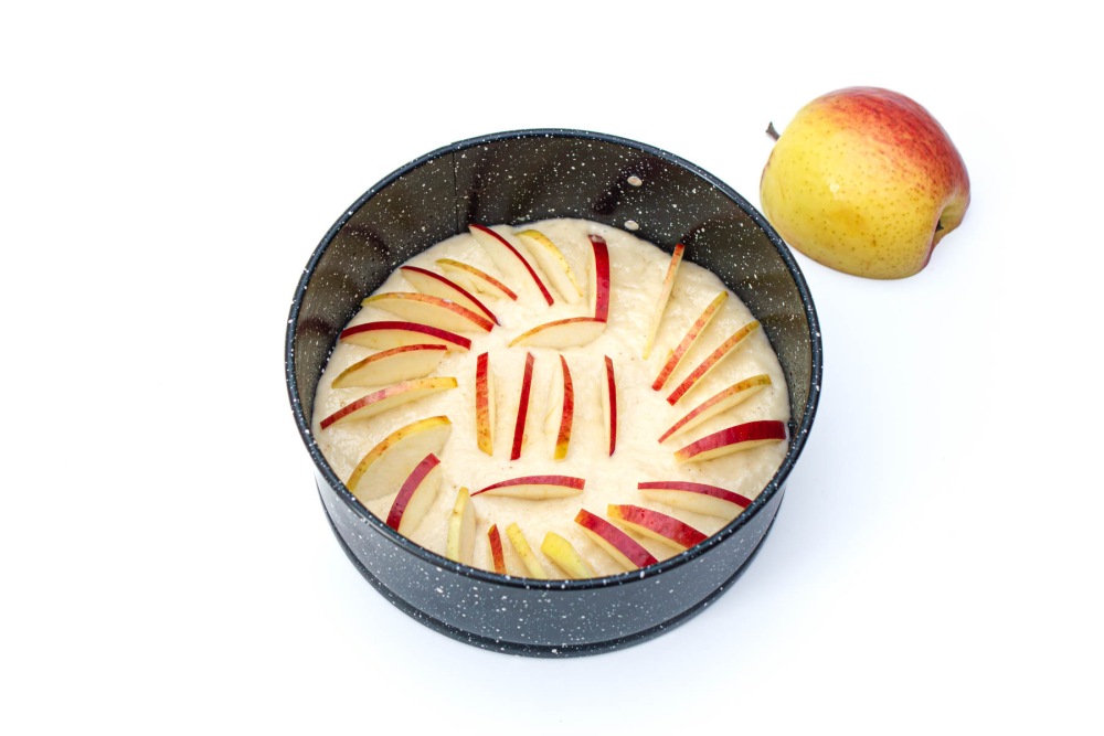 Тесто готовится просто: манка предварительно набухает в воде, а мука с разрыхлителем и ванилином придают пирогу пышность и лёгкость. Яблоки нарезаются тонкими дольками и аккуратно вводятся в тесто, чтобы они равномерно распределялись и сохраняли форму после выпечки.