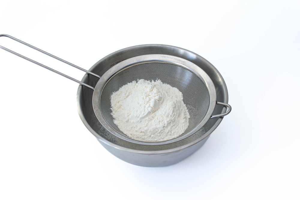 К муке добавить чайную ложку разрыхлителя и щепотку ванилина, хорошо перемешать.