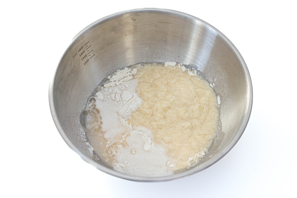 Аккуратно вмешать в сухую смесь набухшую манку, совершая круговые движения снизу вверх.