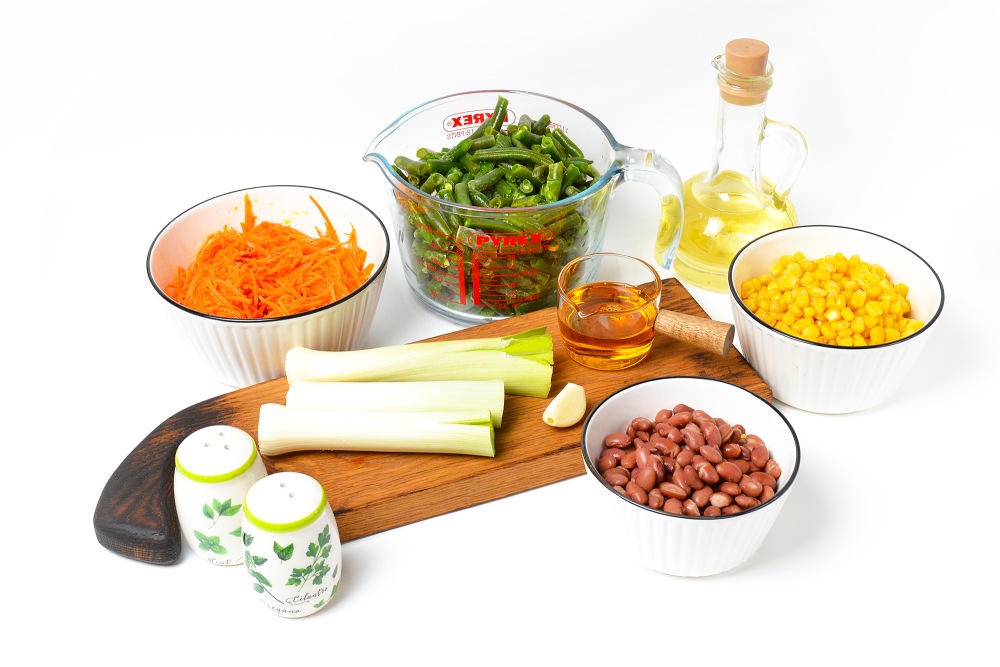 Подготовить ингредиенты: корейскую морковь, консервированную красную фасоль и кукурузу, заранее разморозить стручковую фасоль. Также потребуется лук, чеснок, горчичное масло, соль, перец и масло для жарки.