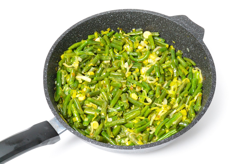 Добавить к луку зубчик чеснока, пропущенный через пресс, и высыпать стручковую фасоль.