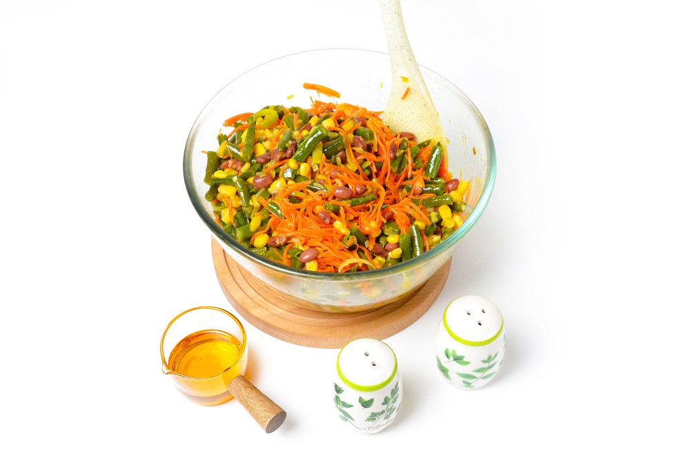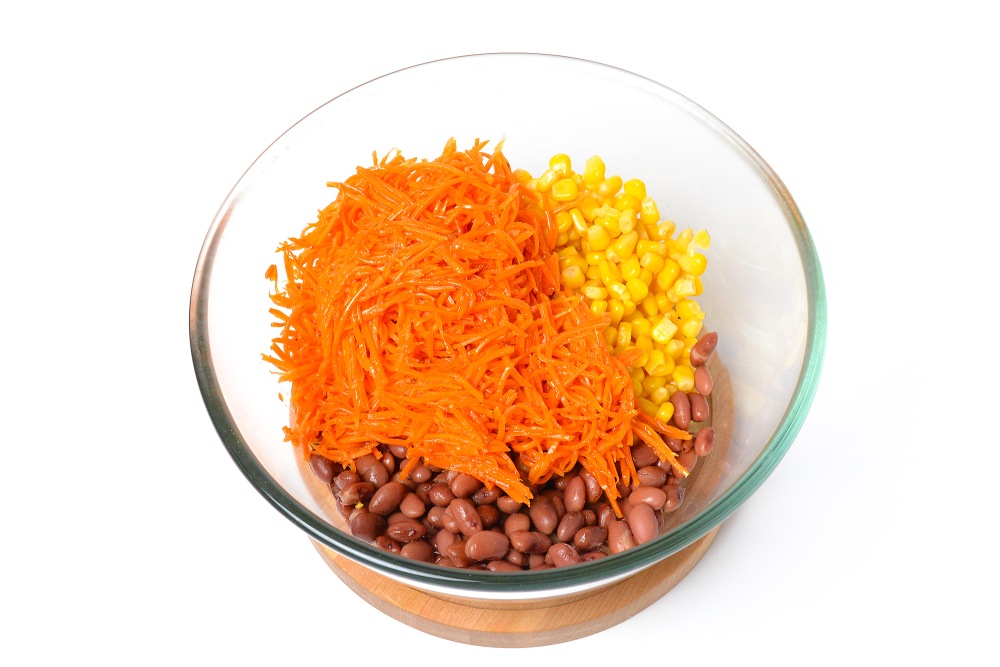 В салатнике смешать красную фасоль, кукурузу и морковь.