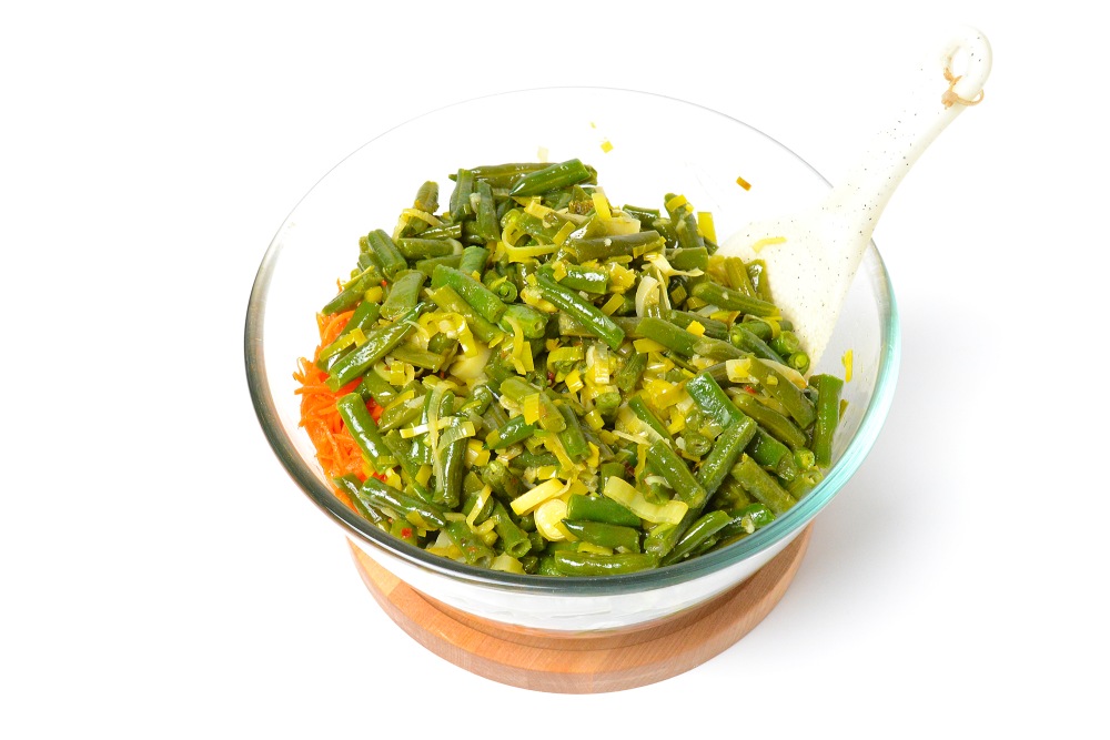 Добавить остывшую стручковую фасоль с луком и тщательно перемешать.