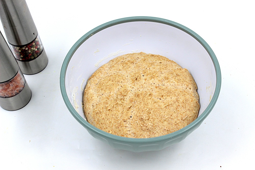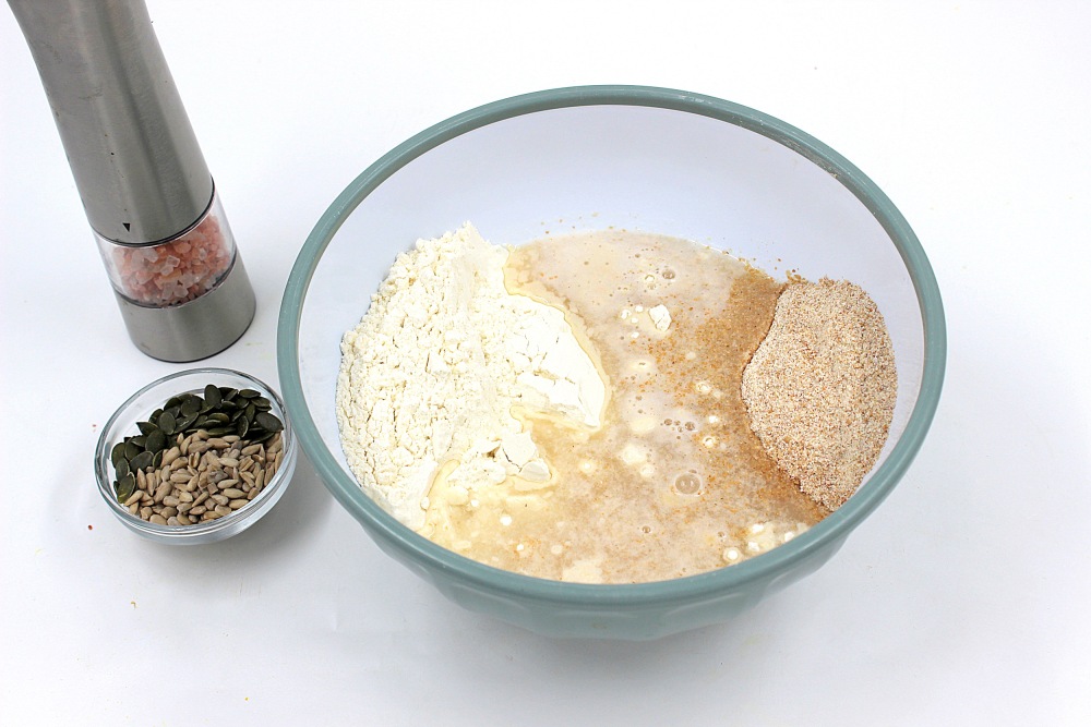 В миску всыпать оба вида муки, влить воду с растворенной в ней солью и активированные дрожжи.